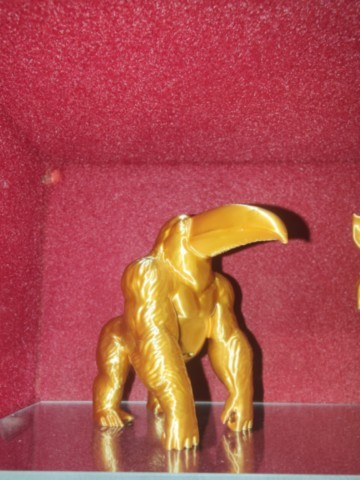 Corps massif et musclé de gorille, avec une posture puissante et des bras capables de briser des troncs. Mais sa tête est celle d’un toucan : bec long et incurvé, aux couleurs vives (jaune, orange, vert), yeux vifs et cerclés de plumes noires. Sa crinière dorsale est faite de plumes épaisses, et ses poils sont parsemés de motifs tropicaux. Il bat parfois des bras comme des ailes, dans une danse rituelle.