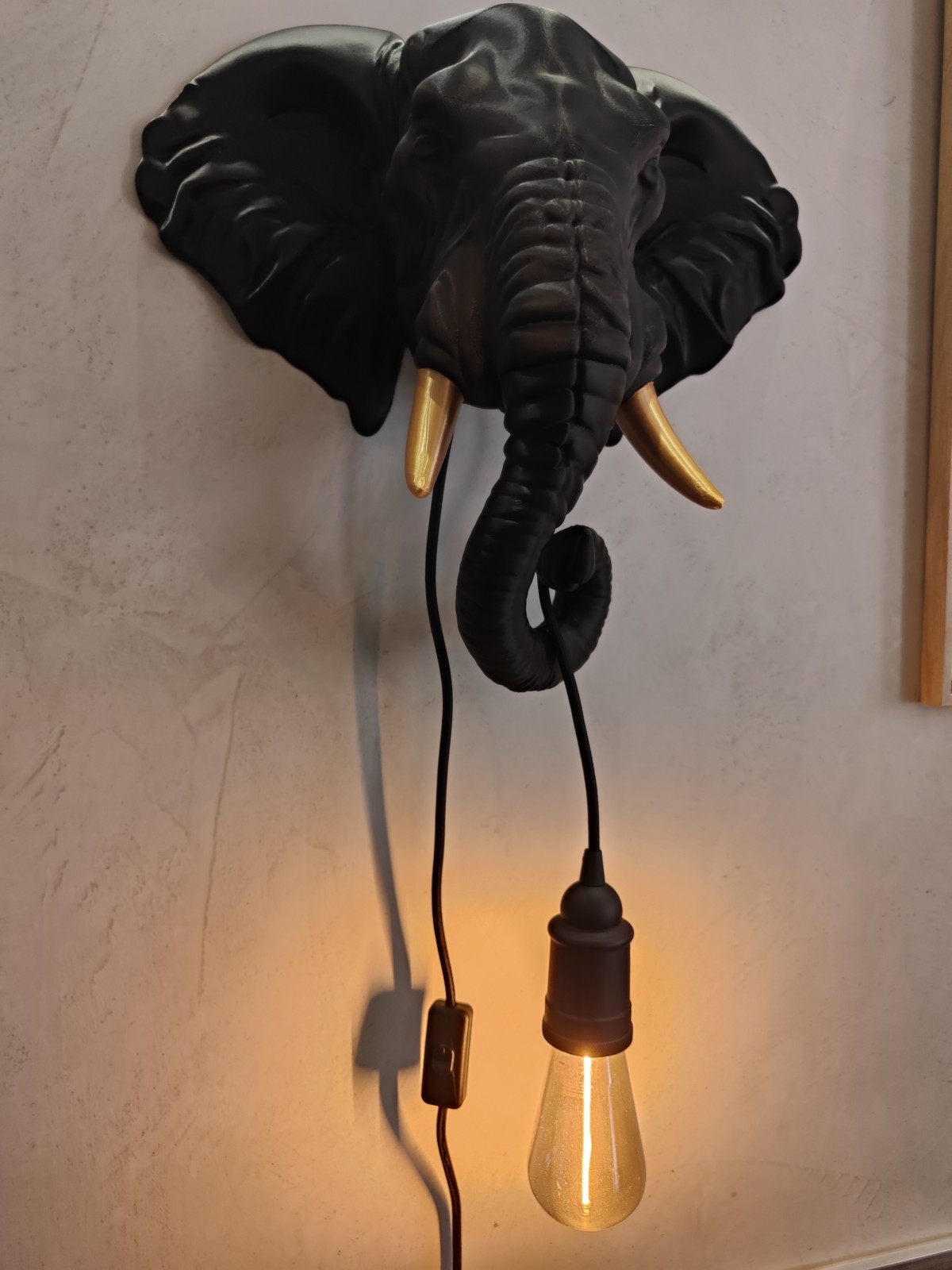 L'applique Elephant est fournie avec son câble secteur avec interrupteur ainsi que la douille