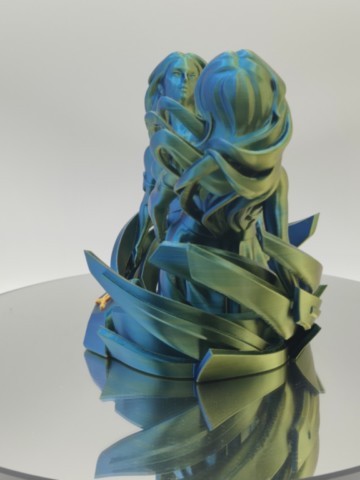 Signe du gémeaux d'une couleur + le signe + une femme d'une couleur et l'inverse pour l'autre, environ 15 cm de haut.